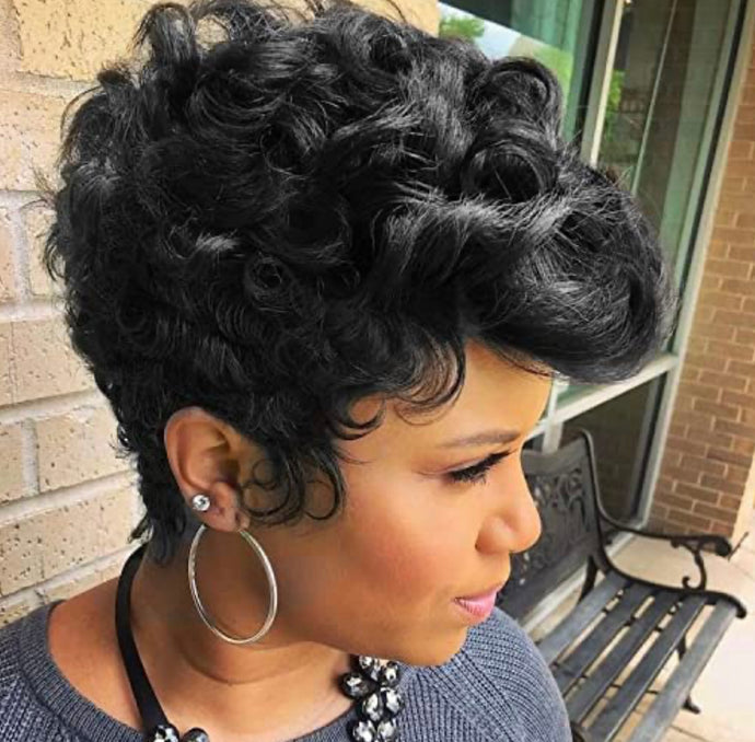 Black Short Cut Human Hair Wig Curly Human Hair Short Pixie Cut Wig Slip on and Go