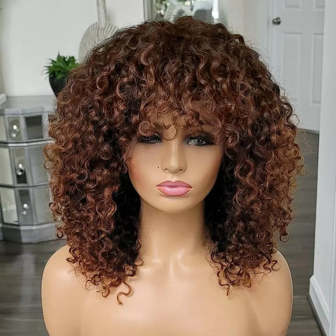 Brown Color Human Hair Curly Wig Full Machine Made No Lace Wig With Bangs #4 Curly Wig Brazilian Remy Hair 250% Density