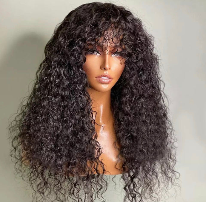 Glueless Water Wave Wig Peruvian Human Hair Wigs With Bangs 180% Full Machine Made Wig