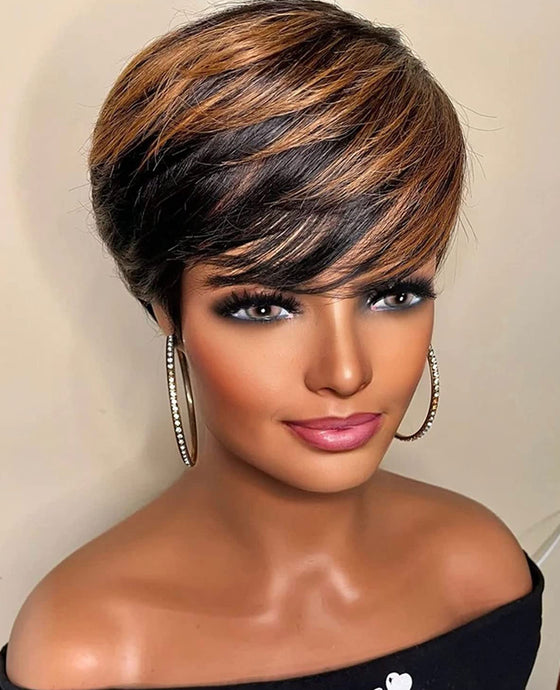 Human Hair Short Layered Cut Wigs with Bangs Brazilian Ombre Wigs Black with Brown 1B/30 Color Short Pixie Cut Wigs