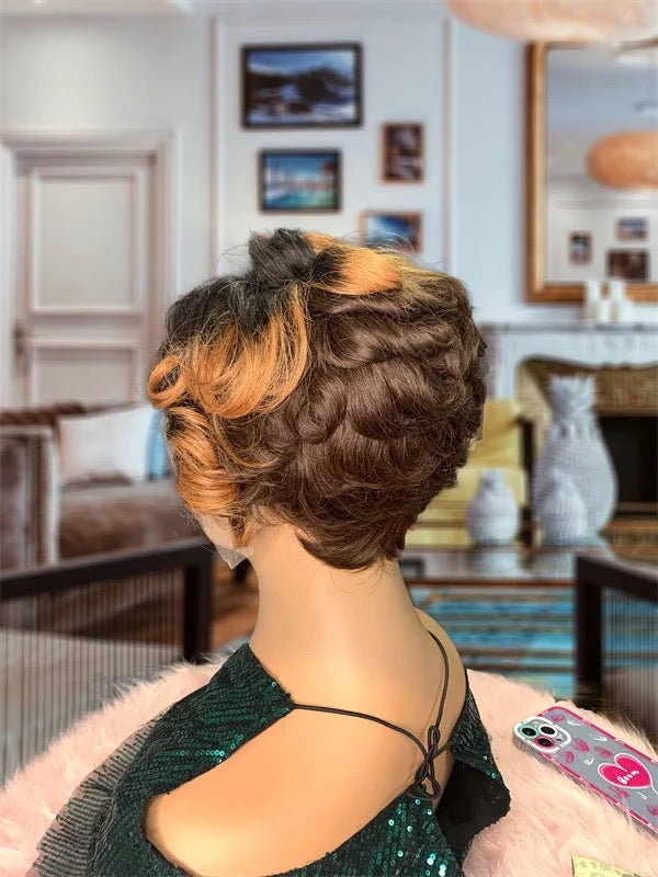 Highlight Colored Short Pixie Cut Bob Body Wave Human Hair Wigs Transparent T Part Lace Wigs Brazilian Hair 150%