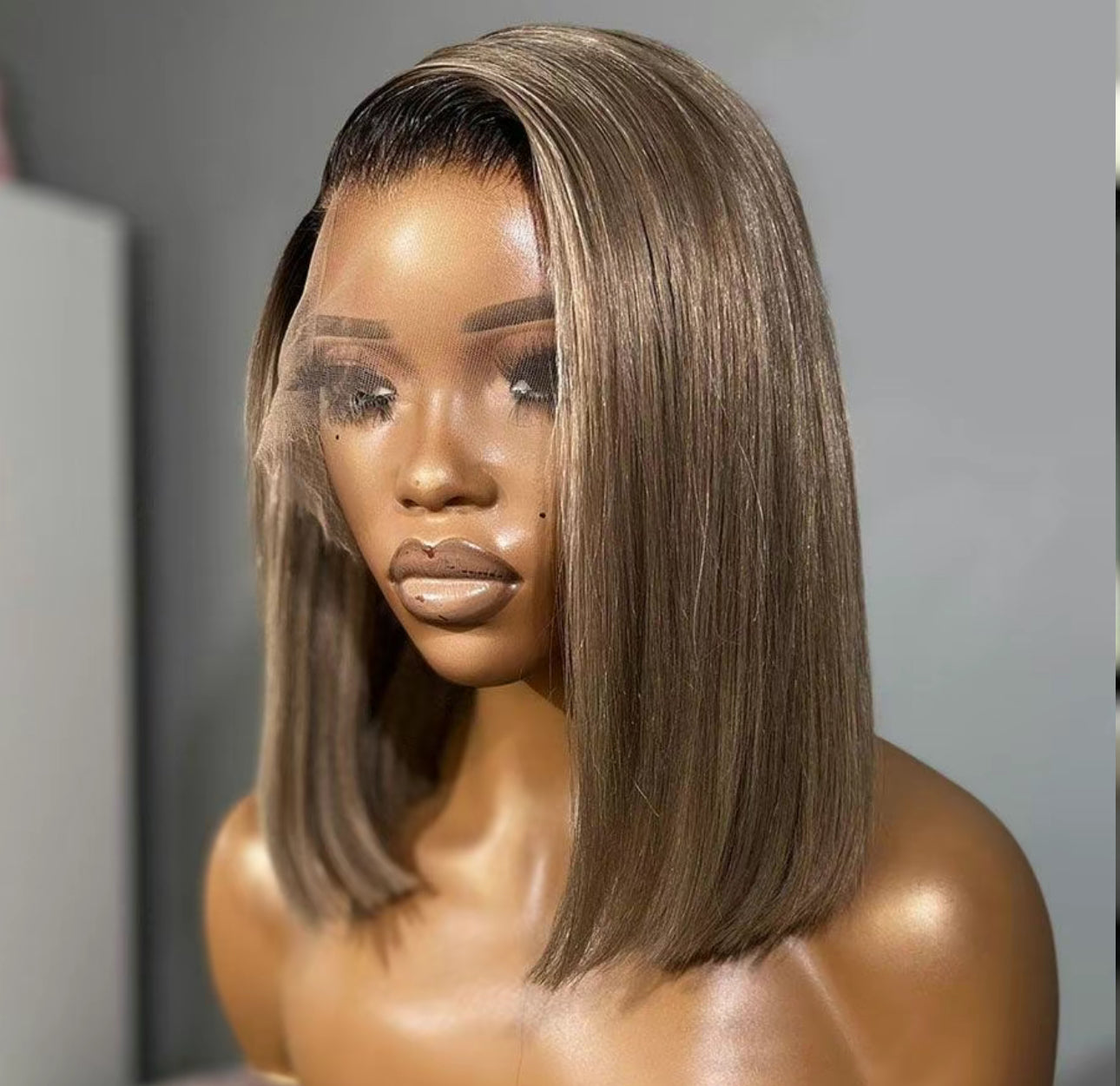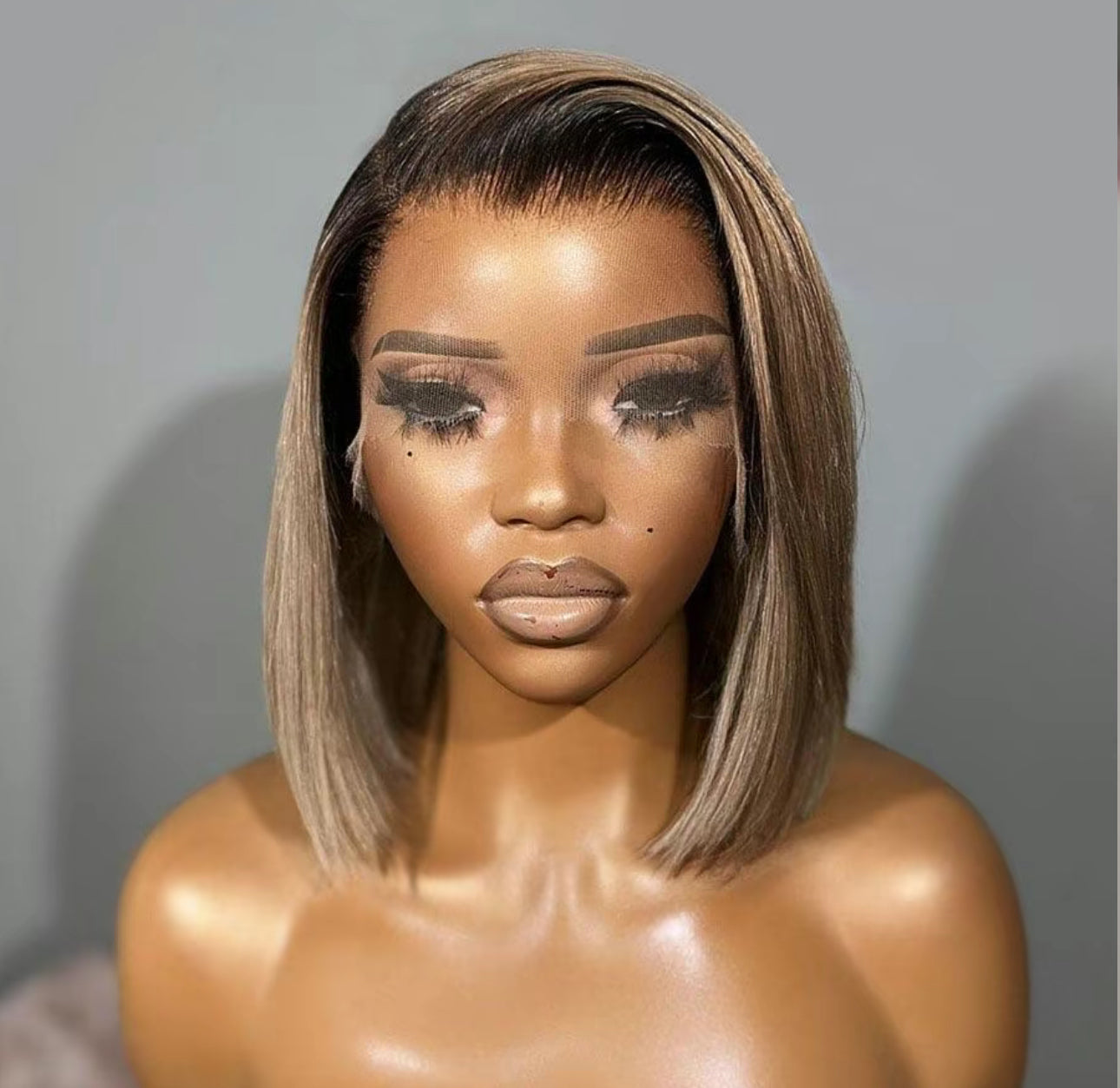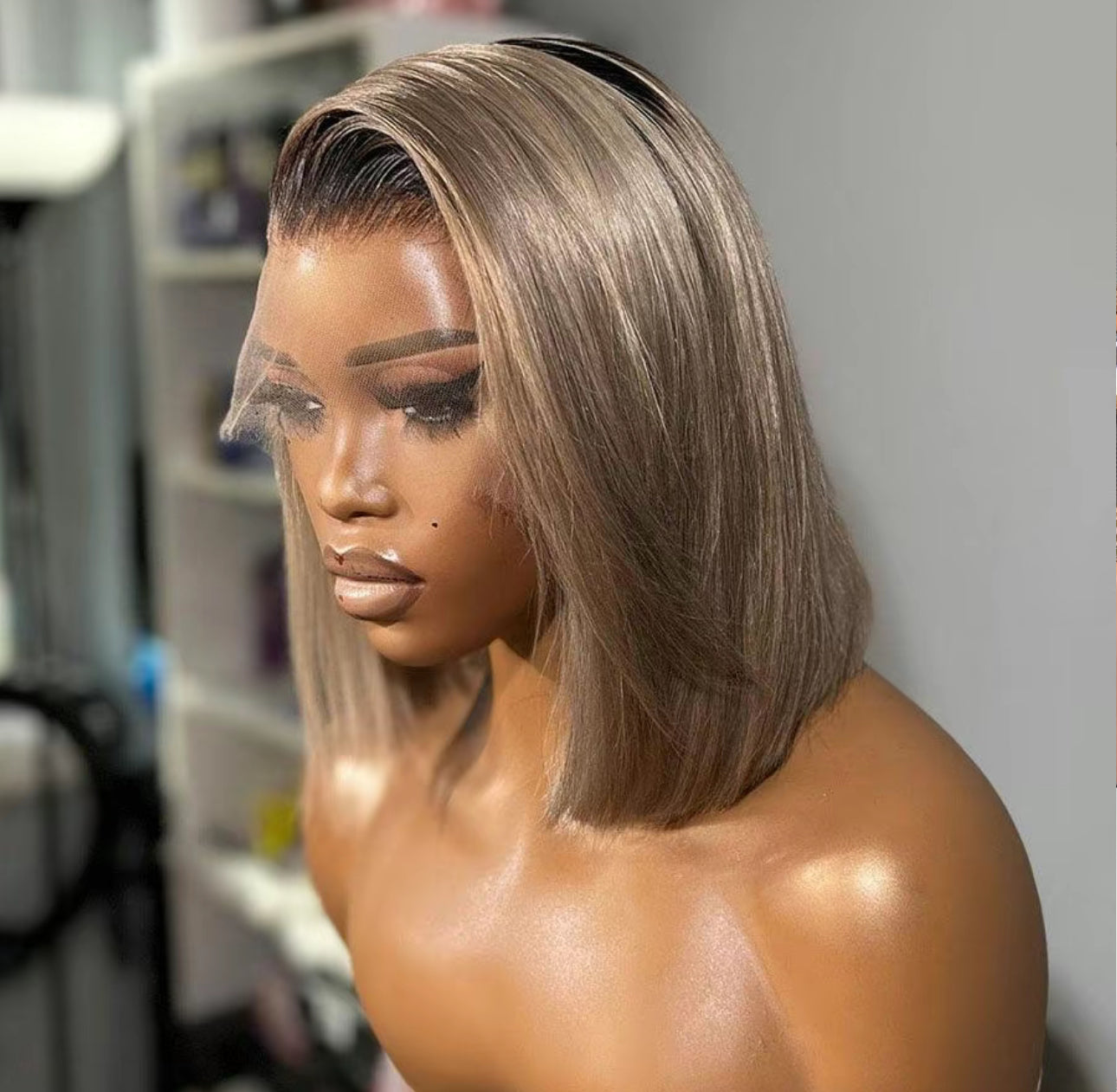 Ombre Ash Blonde 1B Roots Colored 13x4 Lace Front Wig Human Hair Wig 180% Density Remy Straight Short Bob Wig