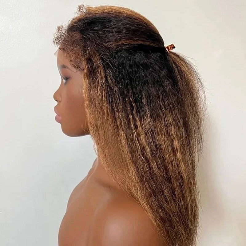Ombre Blonde highlight Yaki Kinky Straight Lace Front Wig With Baby Hair 180% Density